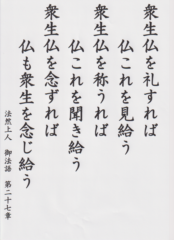 今月の言葉は法然上人語法語第27章の1節です。私たちが阿弥陀さまを礼拝すれば、阿弥陀さまやご先祖さまはこれをごらんになる。私たちがお念仏をを称えれば、阿弥陀様やご先祖様はこれをお聞きになる。私たちが阿弥陀様を念ずれば、阿弥陀さまが私たちををお念じになる。それゆえ阿弥陀仏の三業(さんごう)と私たち行者の三業とが、それぞれに一致して、仏も衆生も親子のようになるので、親縁と名づける」とあります。「親縁」とは、阿弥陀さまと私たちはまるで親子のような関係になることで、何時もいかなる場所でも、阿弥陀さま我々のことを見護ってくださってると解釈します。 今年も残すところあと3か月、どうかお念仏の中に日々をお過ごしください。